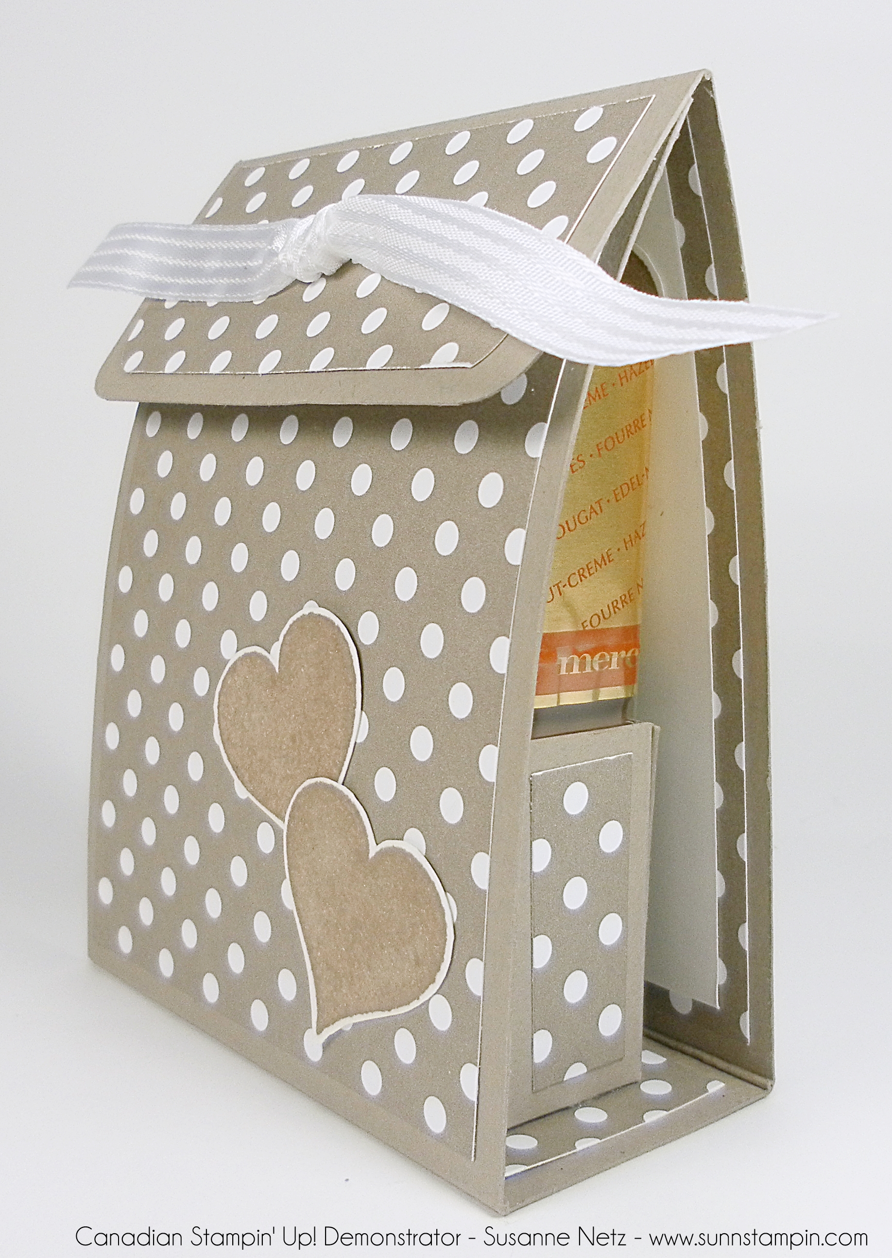 Hi Susanne, at last I know the name of the chocolates used in the lovely box you made on February 26 – I made that box, however it is empty as I don’t have anything to fill it 😦 but it is still pretty 🙂 I like this one you made today too, so simple, but so effective. I was made up with myself because I found the chocolates on Amazon when I was shopping and just added them to my basket, I thought they were a bit pricey; seven quid a box, but I really wanted to try them and make the chocolate pouch as a gift for someone, it wasn’t till I was checking my order I discovered there were only four chocolates in the box – that’s too rich, even for me! I recognize the brand, they make Toffifee; one of my favourites, so I will get my super-shopper (my Dad) on to it and hope he can find some of the Merci for me. A classy looking pouch, that holds a lovely chocolate surprise, what more could you want!?! chocolate in my case LOL! Great tip about the ribbon knot (I am going to write that down), I was never in the Brownies and am all fingers and thumbs, sometimes my bows and knots are perfect, other times just a horrible mess. Thanks for another crafting session x Love to you x and give Molly & Quinn a stroke from me xx