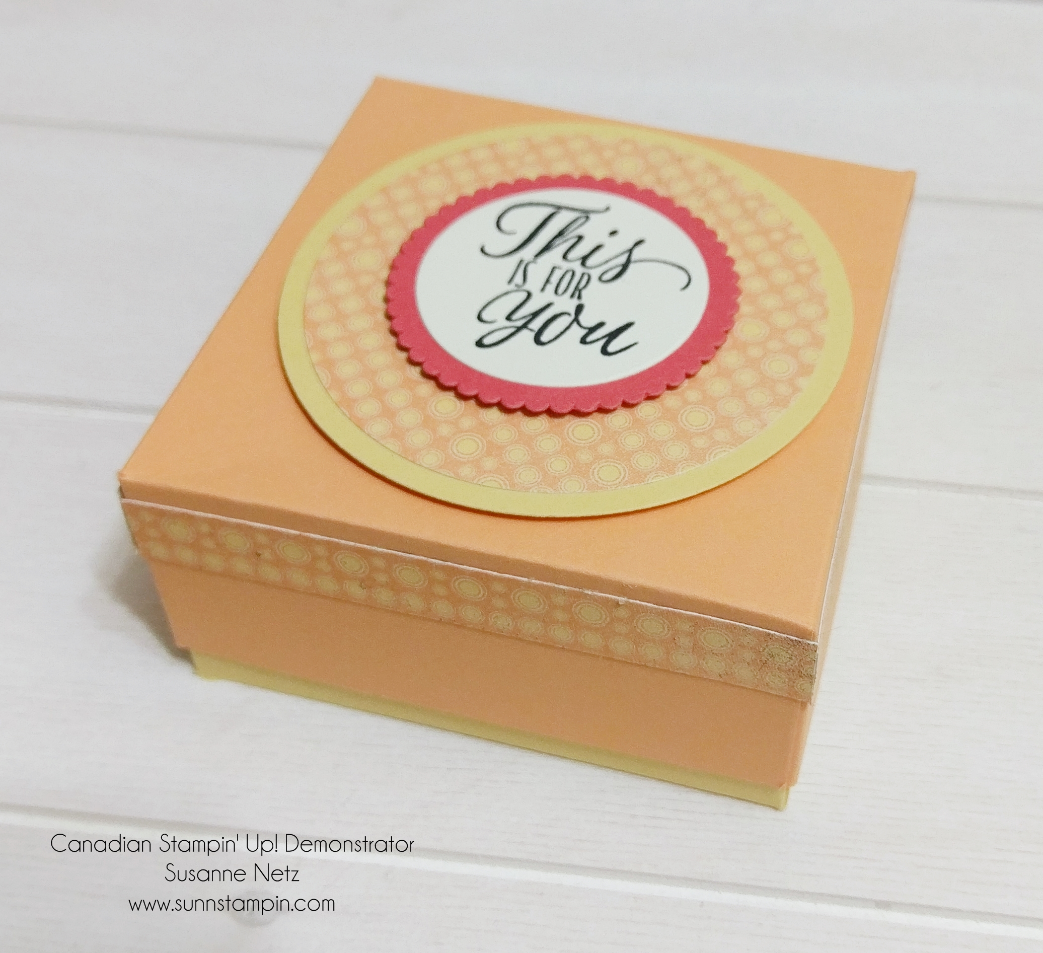 Hello there.  How are you all today.  I hope you are starting off your weekend with something fun to do.  If not, here’s a fun box to make to keep you entertained. 🙂  I’m a giver, what can I say?  Lol.  I hope you enjoy today’s project, as it is using my favorite patterned paper “Cupcakes & Carousels”.  To my knowledge, I have never been on a carousel, my Mom may correct me if I am wrong, she comments on most of my blog posts and she’s my editor (I need something stronger than spell check, don’t you know?)  Anyway, I just love the vintage feel of the design and of course the colours.  So saffron is my favorite yellow and I really dig the peach too.  Tell me what your favorite Stampin’ Up! colour is…I would like to know.  On with the show…