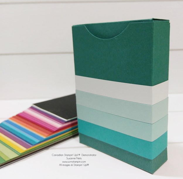 Hello there.  Just thought I would shine a little light on one of the tools that I use for design.  Years ago, Stampin’ Up! used to have a similar product called “The Colour Coach” and it was similar to what I use today except I use real card stock and I tend to pull the cards out and check to see if I like the colour combinations together.  Many times I take my cues from the patterned paper where the colours are listed but sometimes I just want to do my own thing.  That’s where this deck of cards comes in.  However, I needed something to house them all in so I thought that you may be interested in something like this as well.  Check it out.