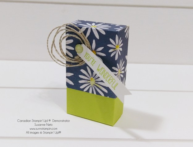Hello there. I have decided that the new In-colour Lemon lime twist goes with everything. It’s like the colour that compliments almost everything. I have not tried it with purples yet but that may be next. Lol. So, here is my sweet little project today and I used lemon lime twist as the base for the box. The patterned paper is delightful daisy and, as I say in the video…it does not have any lemon lime in it but that colour sure goes well with the paper. Check it out.