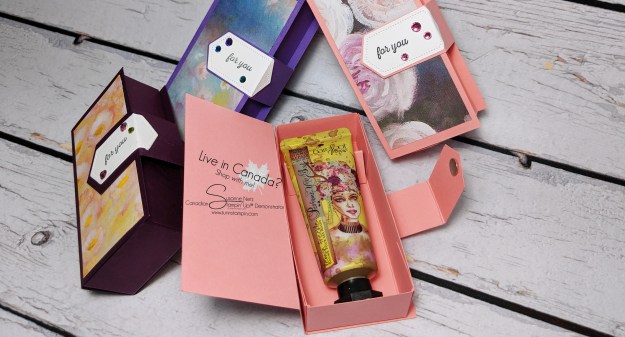 Hello there. You may or may not know this but last year I earned Stampin’ Up!’s coveted incentive trip with the help of my lovely customers and team members. I wanted to bring some little handmade boxes with some lotion that is made in my home town to some of the folks that I have met online and will be meeting for the first time in person this week. This is what I have come up with. Check it out.