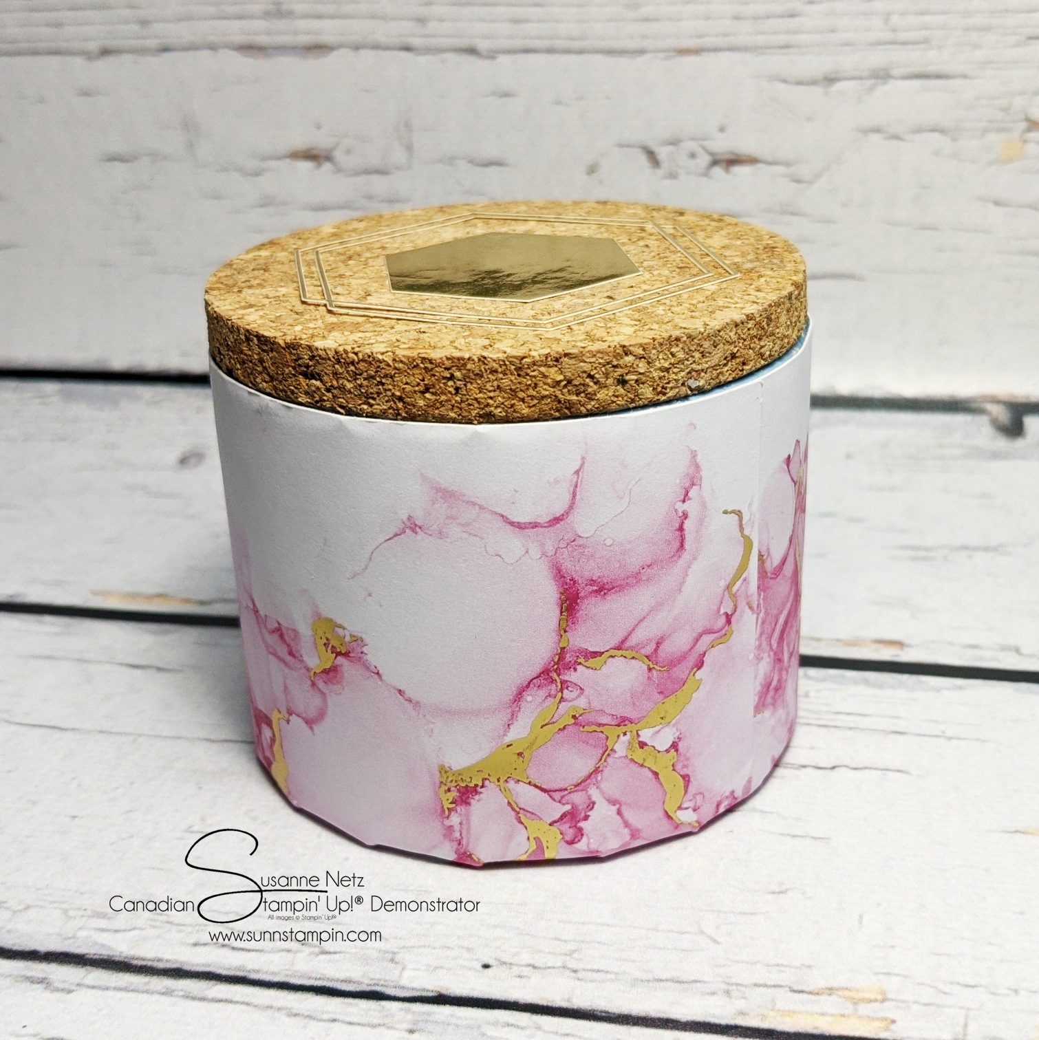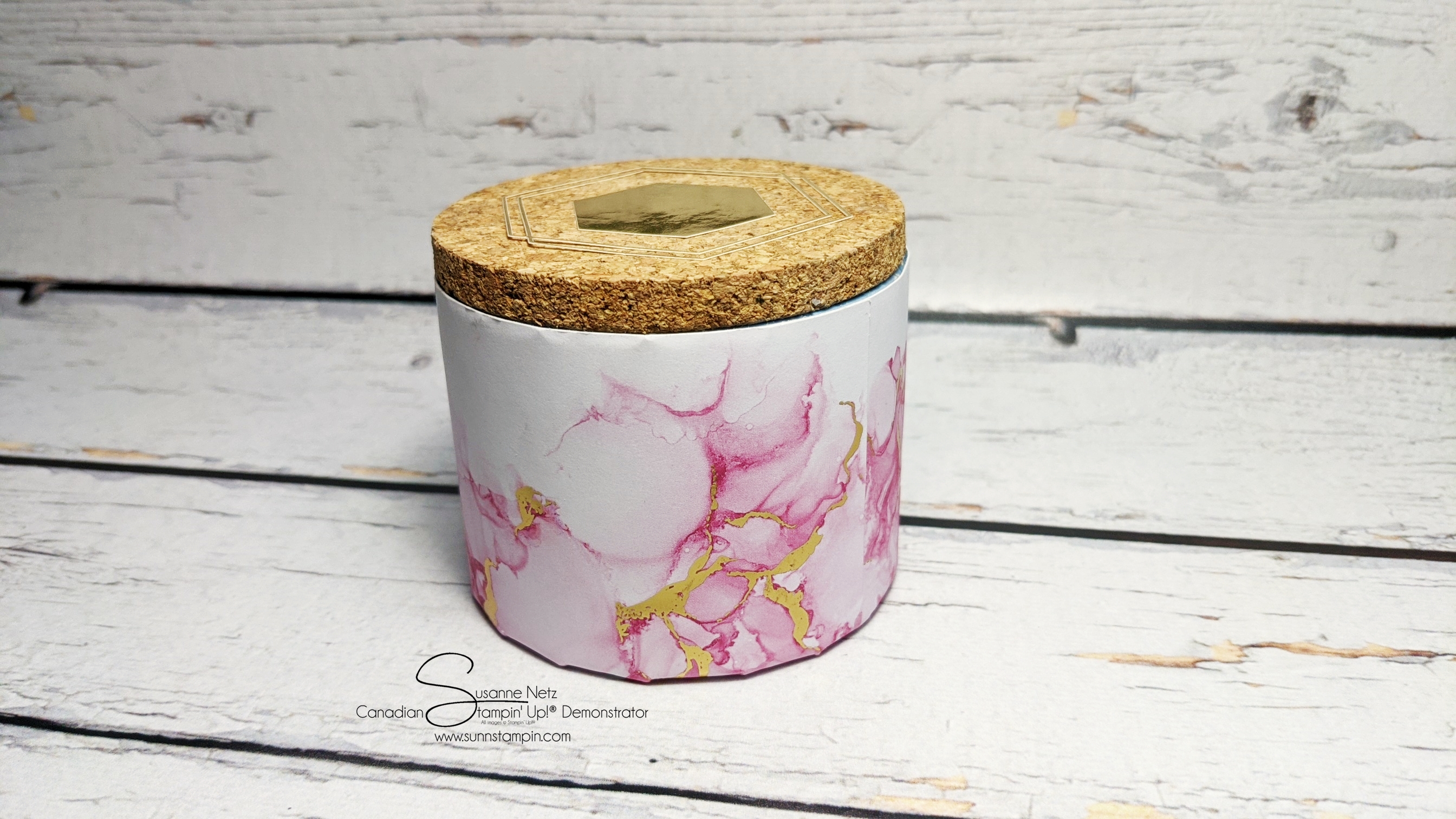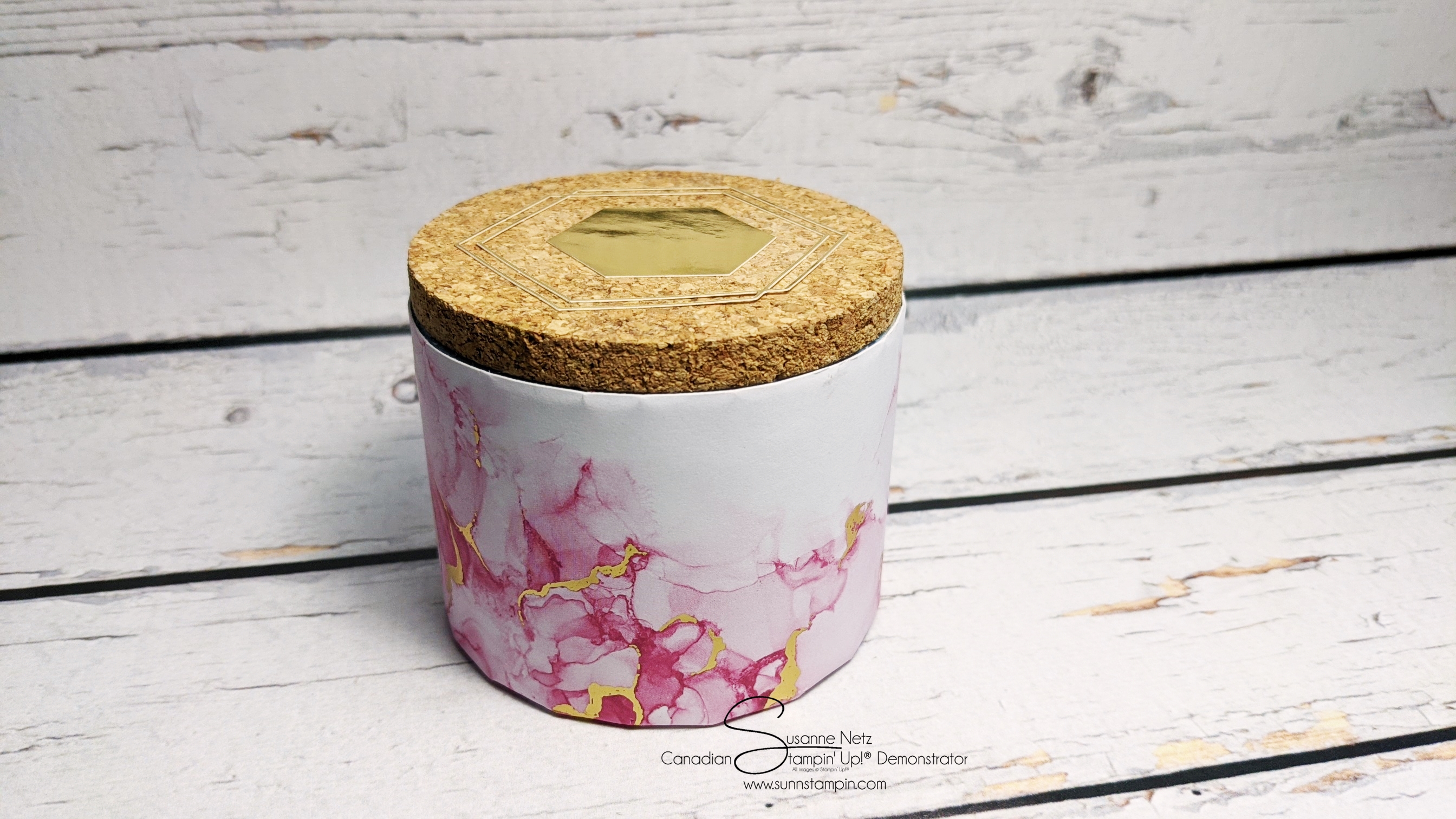 Today’s project is an upcycled Fleu de Sel container that I just didn’t want to recycle because of the fabulous cork lid. I ended up covering it with the Expressions in ink Designer Series Paper. Did you know that this paper has a ephemera pack that goes with it. I was apart of my own product share and we all got these amazing gold elements to decorate with. You can find it here in my Canadian Online Store