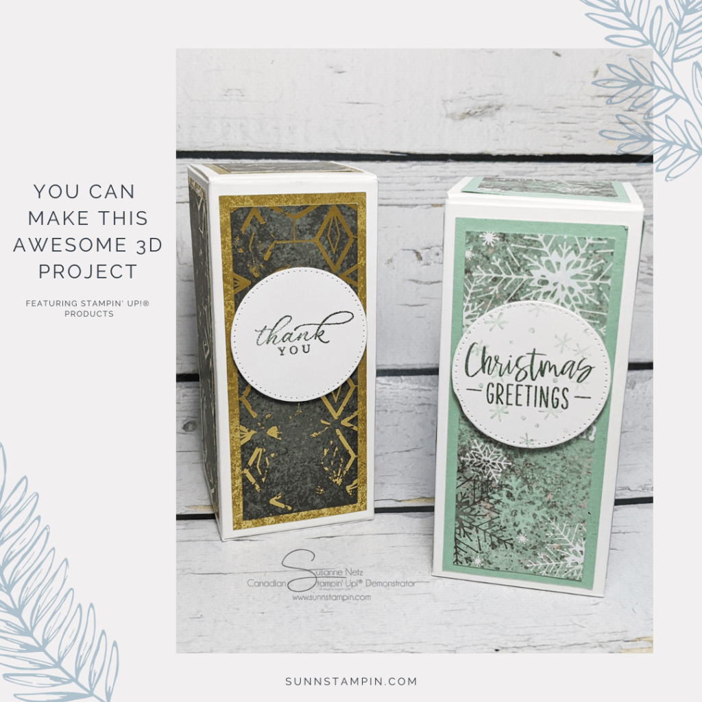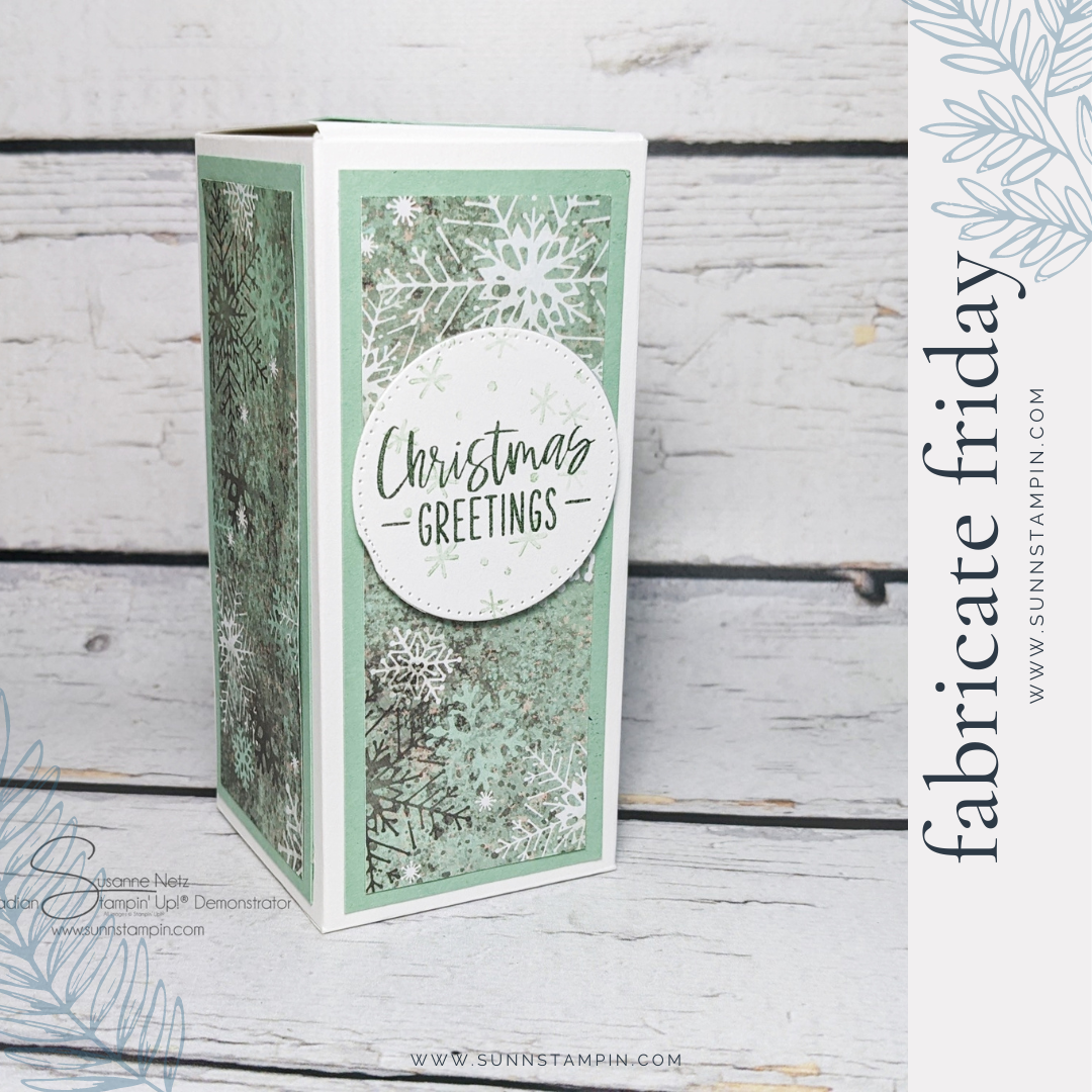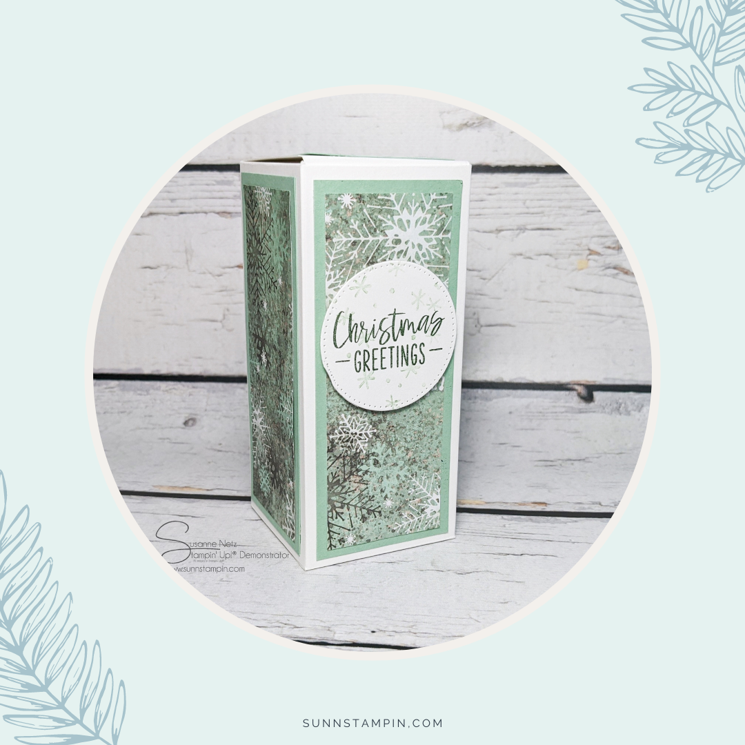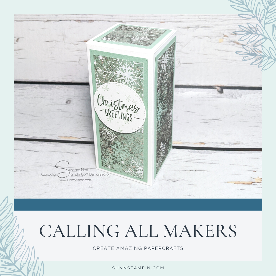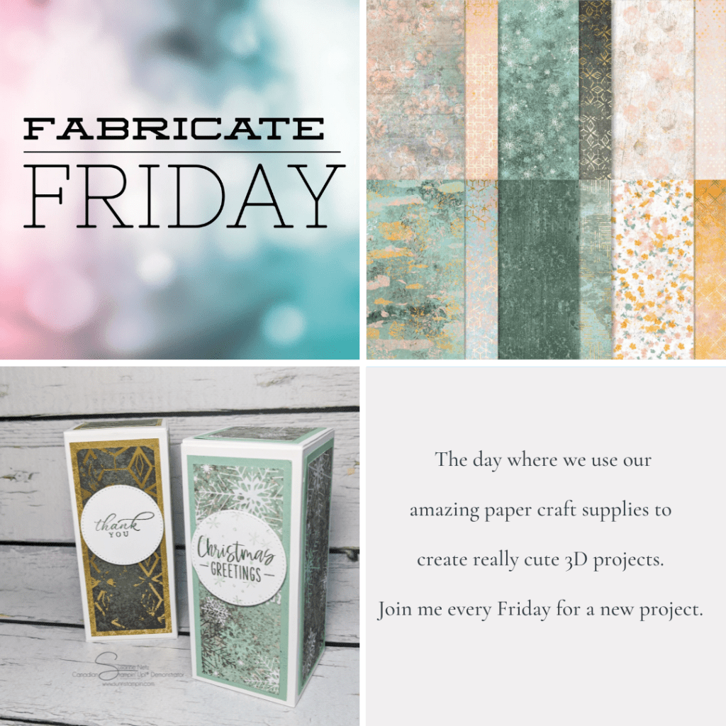 Yes, I have used one of our patterned papers from the Annual catalogue to create a Christmas themed box. I know it’s too early to share holiday ideas but since it’s my mission to use up all my patterned papers BEFORE they retire…this box had to be made. The patterned paper is called Texture Chick and it’s got a lot of gold, green and fun patterns going on. However there is one that has snowflakes and I am a sucker for snowflakes. Check out this fun snowflake covered box.