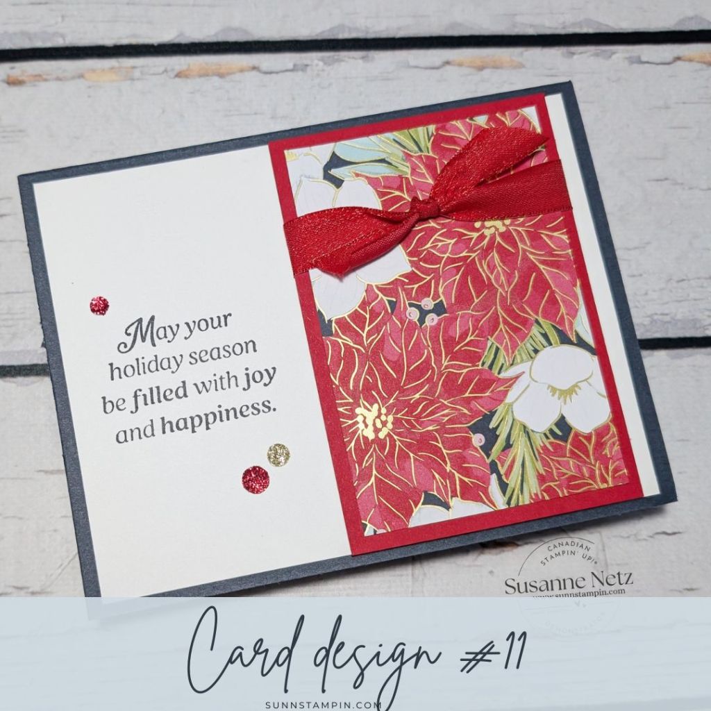 You have probably figured out that Monday’s cards are easy to make, duplicate and still have a wow factor. Simple cards are not plain but rather restrained. I love simple cards and have practiced years to restrain my self from adding everything plus the kitchen sink on cards. I am still a student of this practice but do enjoy when I get it right.