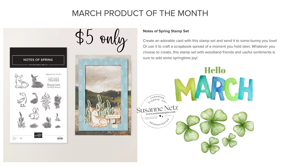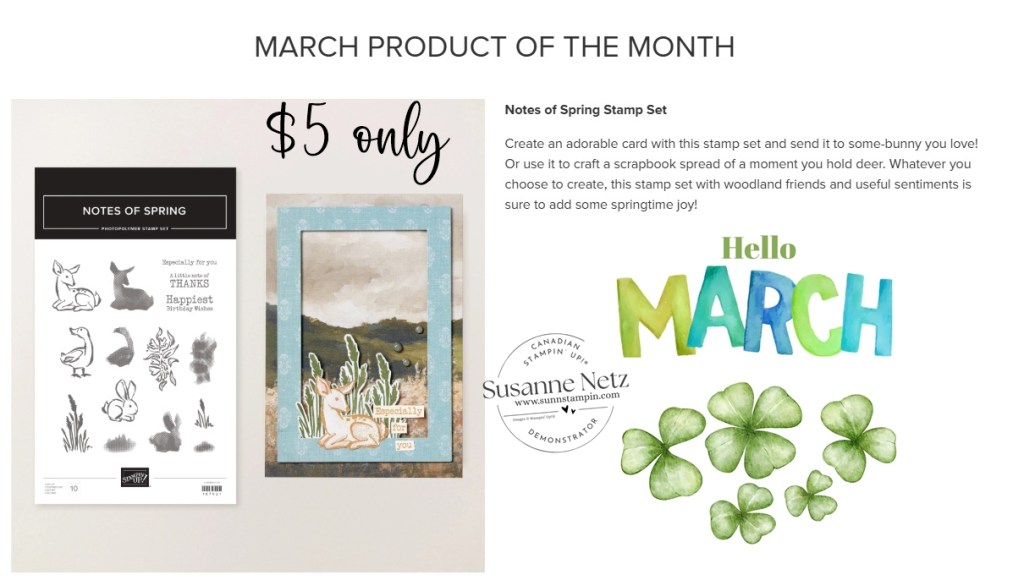 Hi friends. I am happy to share the new PRODUCT OF THE MONTH with you before I share my one layer project for today. Check it out – with a card of $100 you can get this stamp set for $5 – Month of March only.