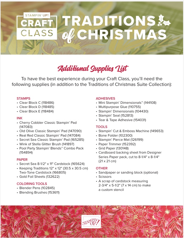 - Order the supplies. You order the Traditions of Christmas Suite Collection and any additional supplies needed so you have everything ready to go before you view the class. You can find the Additional Supplies List below.